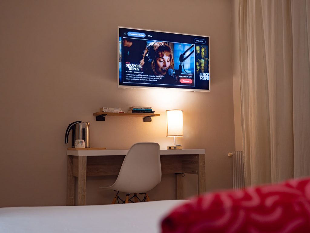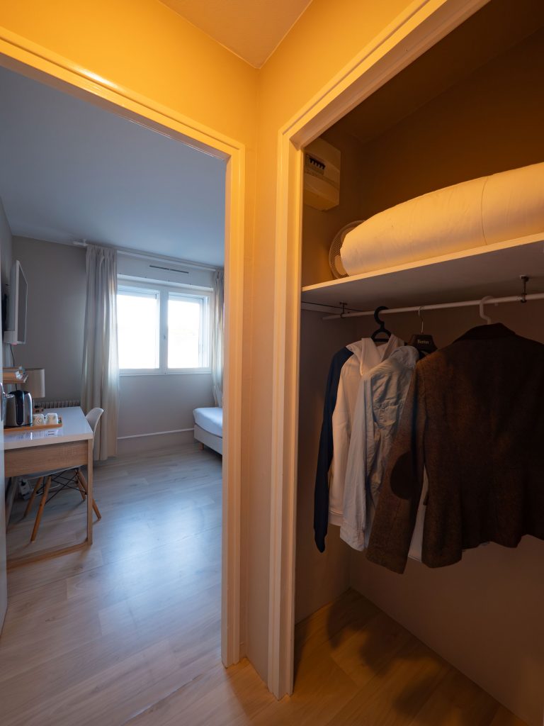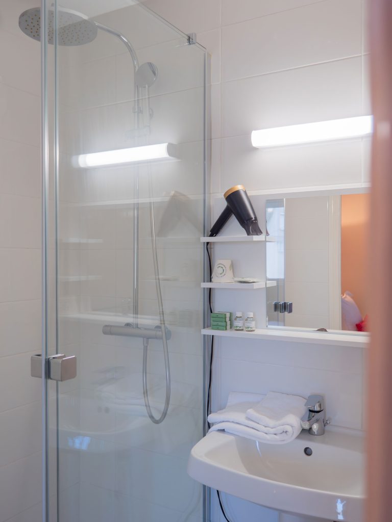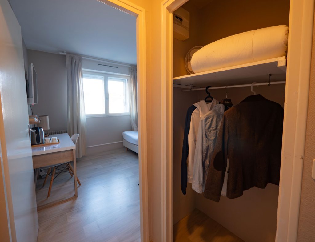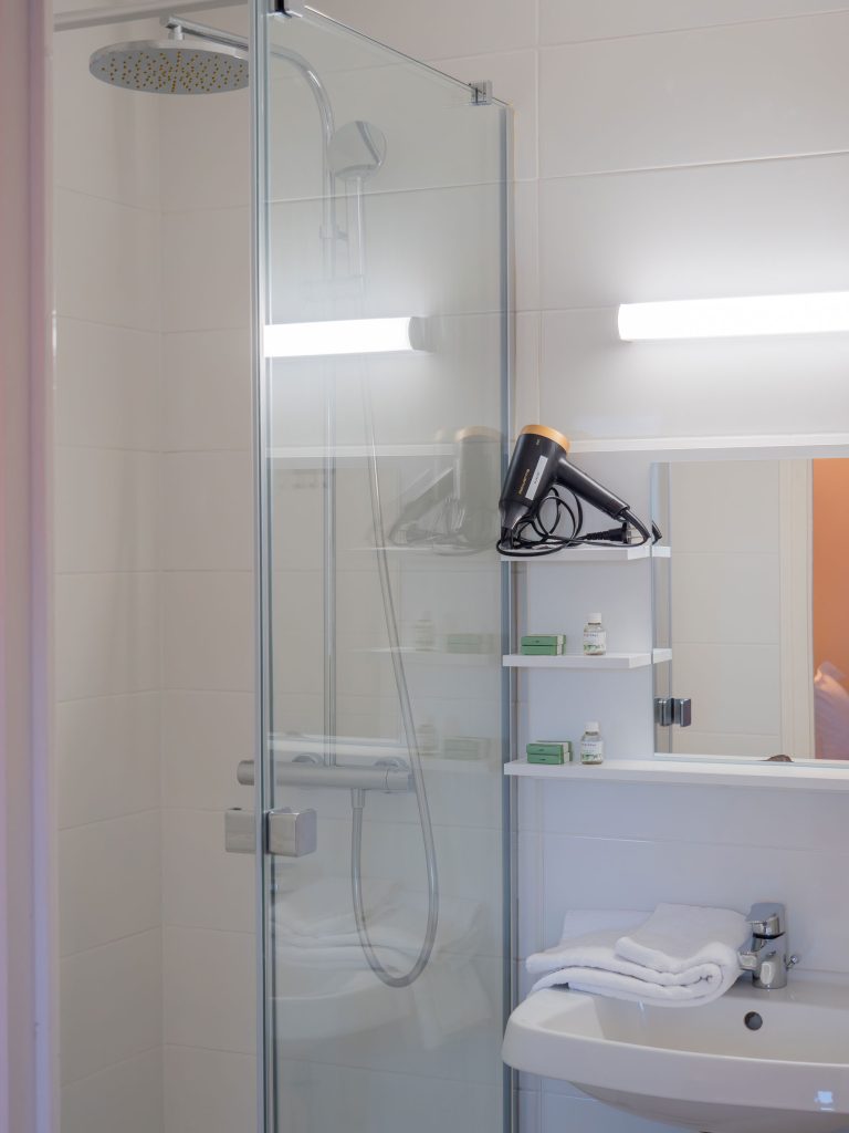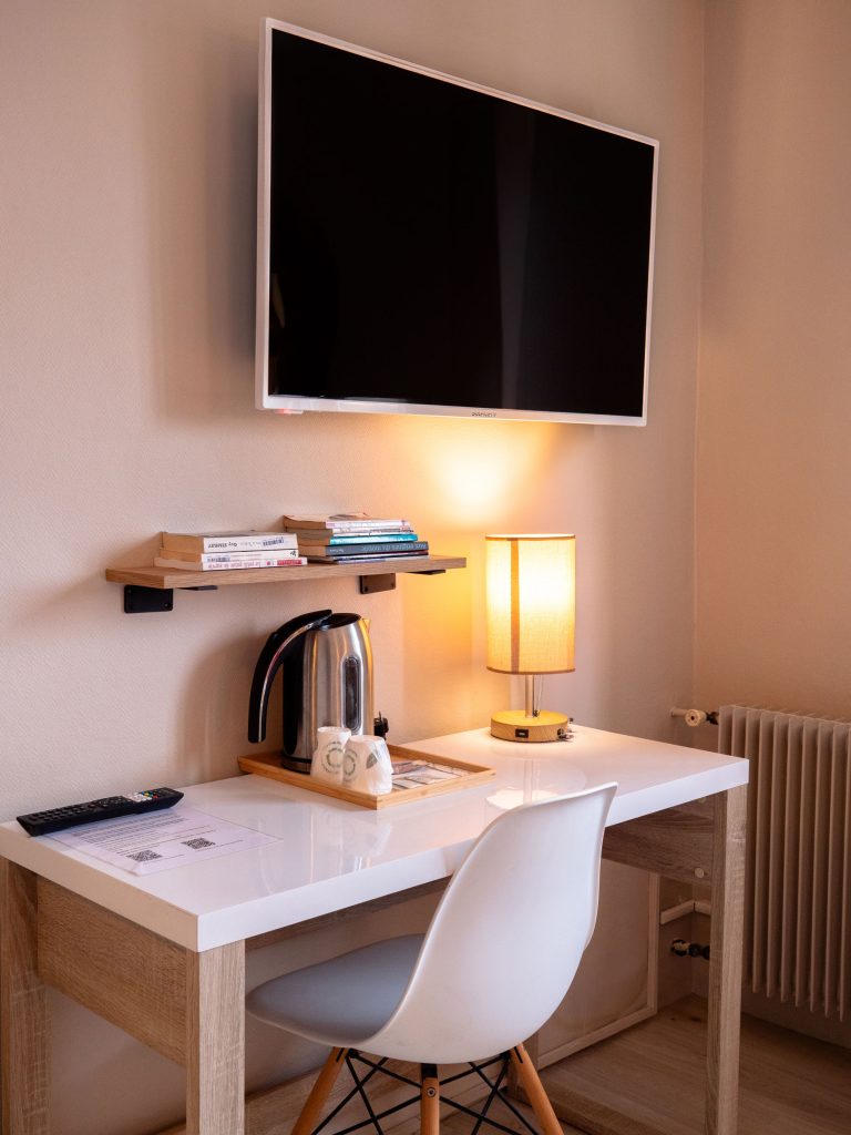 21 chambres tout confort équipées d’un lit queen-size 160×200 cm, WiFi fibre haut débit inclus, Smart TV (Netflix, Prime avec vos codes), plateau courtoisie thé/café, sèche-cheveux. Facturation société disponible. Tarifs professionnels à partir de 59 € TTC/nuit.